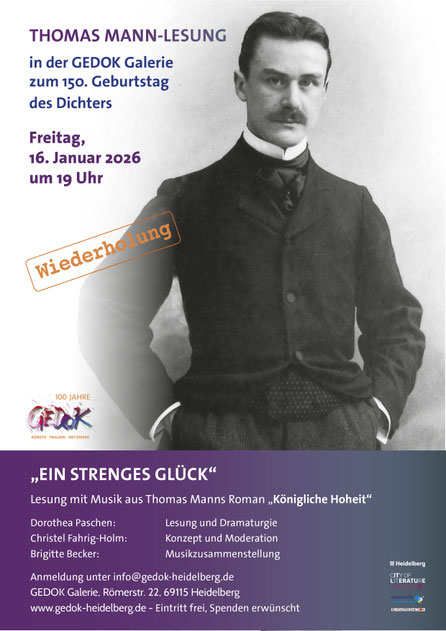 Zum 150. Geburtstag von Thomas Mann veranstaltete die GEDOK Heidelberg im Jahr 2025 eine Lesung mit Musik aus seinem Werk Königliche Hoheit, die nun wegen der großen Nachfrage wiederholt wird. Dieser nach den Buddenbrooks zweite Roman des Autors fand bei seinem Erscheinen begeisterte Resonanz beim Publikum, während der Autor selbst ihn mit einem eher kritischen Blick betrachtete. Vielleicht wegen des im Werk Thomas Manns sonst nicht üblichen glücklichen Ausgangs der Liebesgeschichte? Vielleicht auch wegen des dekadenten höfischen Ambientes, wegen märchenhaft anmutender Zutaten, wegen des teilweise grotesk überzeichneten Personals?